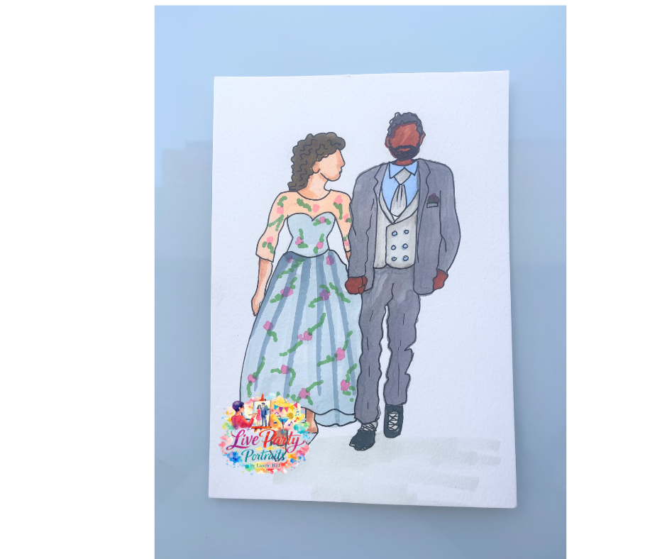 My portraits are faceless, yet this doesn't diminish the character of your guests. I love capturing their unique charisma and charm, ensuring each piece truly reflects the individual. I also enjoy adding a touch of glitter and glam to the paintings, making them extra special and memorable keepsakes for your guests.